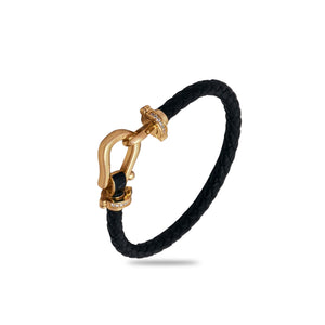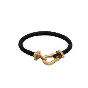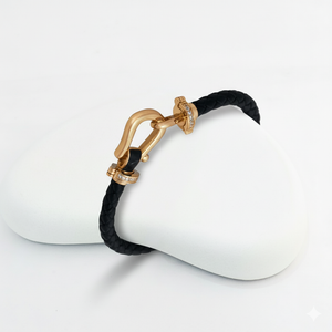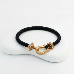 This fashionable bracelet features a sleek, braided black leather band, perfectly complemented by a gold-plated hook clasp with studded stone detailing. Its modern and sophisticated design blends ruggedness with elegance, making it a versatile accessory for both casual and semi-formal occasions. The clasp is adorned with tiny stones, adding a touch of sparkle to the overall minimalist look. This piece is ideal for those who appreciate contemporary fashion with a hint of luxury.