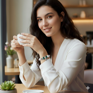 This stylish and chic bracelet features a combination of silver-toned charms and large pearls. The centerpiece is decorated with green gemstone beads, flanked by ornate metallic designs, including a peace symbol and a heart pendant for a touch of elegance and symbolism. The bracelet's adjustable band provides both comfort and versatility, making it a perfect accessory for both casual and formal occasions.