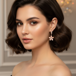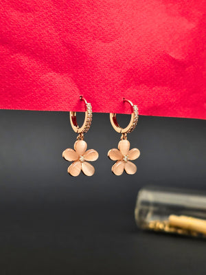 These beautiful rose-gold toned floral earrings are designed to elevate any outfit. Featuring delicate flower-shaped pendants with a shimmering central stone, the earrings hang from a stone-embellished hoop. The soft texture of the flower petals adds a feminine and sophisticated touch, making them perfect for both casual and formal occasions. The combination of a sleek, modern look with timeless floral motifs makes these earrings a versatile accessory for any jewelry collection.