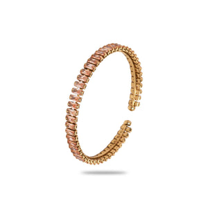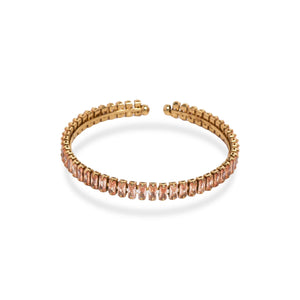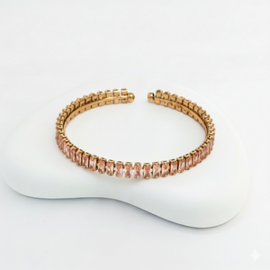 This stunning open cuff bracelet features a delicate row of rectangular, crystal-clear baguette stones set in a gold-plated frame. The shimmering stones beautifully reflect light, adding a touch of elegance and sophistication to any outfit. The classic design makes it a versatile accessory for both everyday wear and special occasions. Its easy-to-wear open design is perfect for adding a luxurious touch without the need for intricate clasps.