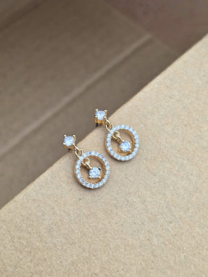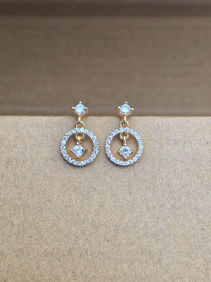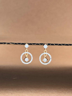 The image displays a pair of hoop earrings, each featuring a delicate circular design with an open center. The earrings are adorned with numerous small, clear crystals that add a sparkling effect to the overall aesthetic. The hoops are suspended from a smaller crystal-studded element that attaches to the earlobe.