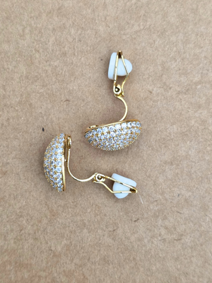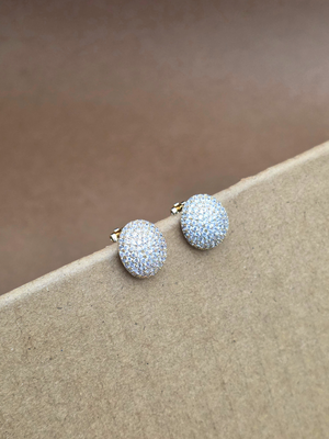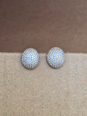 A pair of round-shaped stud earrings. These earrings feature a meticulous arrangement of small, clear stones set in a dense pattern that covers the entire visible surface, giving them a sparkling and luxurious appearance. The base metal is not specified but appears to be gold-toned, complementing the clear stones and enhancing the overall elegance of the design. The earrings are designed for pierced ears, as suggested by their stud form factor.