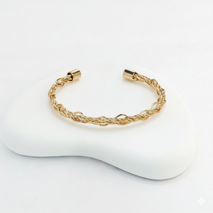This sleek and sophisticated open cuff bracelet features a beautifully twisted rope design. Crafted from a golden-toned metal, the minimalistic yet intricate weaving makes this bracelet a versatile accessory for any occasion. Its open-ended design allows for easy adjustability, offering both comfort and style. Perfect for casual wear or as a refined statement piece for more formal events.