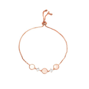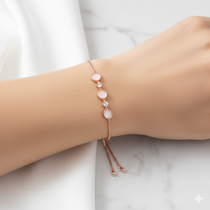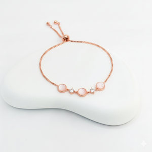 This chic and minimalistic rose gold bracelet adds a touch of elegance to any ensemble. It features three circular accents with lustrous mother-of-pearl details, paired with sparkling cubic zirconia stones that enhance its beauty. The adjustable sliding closure allows for a perfect fit, making it versatile for daily wear or special occasions. This piece is a perfect blend of modern trends and timeless design, crafted to elevate your style effortlessly.
