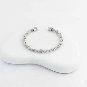This sleek and sophisticated open cuff bracelet features a beautifully twisted rope design. Crafted from a silver-toned metal, the minimalistic yet intricate weaving makes this bracelet a versatile accessory for any occasion. Its open-ended design allows for easy adjustability, offering both comfort and style. Perfect for casual wear or as a refined statement piece for more formal events.