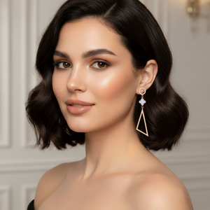 These striking Geometric Rose Gold Triangle Drop Earrings are designed to make a bold statement. Featuring a unique triangular shape at the bottom and a delicate clover accent in the center, these earrings offer a modern, sleek look. The rose gold finish adds a touch of warmth and sophistication, making them perfect for both formal and casual outfits.