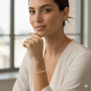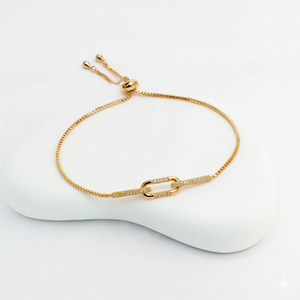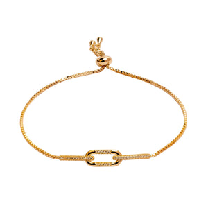 This chic and sophisticated bracelet features a sleek, gold-plated chain with a central pave-encrusted link design, adding a touch of sparkle and elegance. The adjustable pull-chain closure ensures a customizable fit, making it perfect for any wrist size. With its minimalist and refined aesthetic, this bracelet is ideal for both casual and formal wear, adding a modern touch to any outfit.