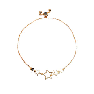This stunning bracelet features multiple star-shaped charms in a sleek gold-plated finish, with a central openwork star design that captures attention. The adjustable pull-chain closure ensures a perfect fit for any wrist, adding versatility to its chic and celestial look. Ideal for both casual wear and festive occasions, this bracelet embodies a modern minimalist charm, perfect for those who love subtle yet striking accessories.