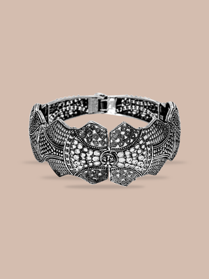 This bold and intricately detailed oxidized silver bracelet showcases traditional craftsmanship with ornate patterns and motifs. The bracelet is perfect for those who love ethnic and statement jewellery. Its antique finish gives it a vintage appeal, while the intricate design exudes elegance and cultural richness. Ideal for festive occasions, weddings, or any traditional events, this bangle will add a touch of heritage-inspired charm to your look.