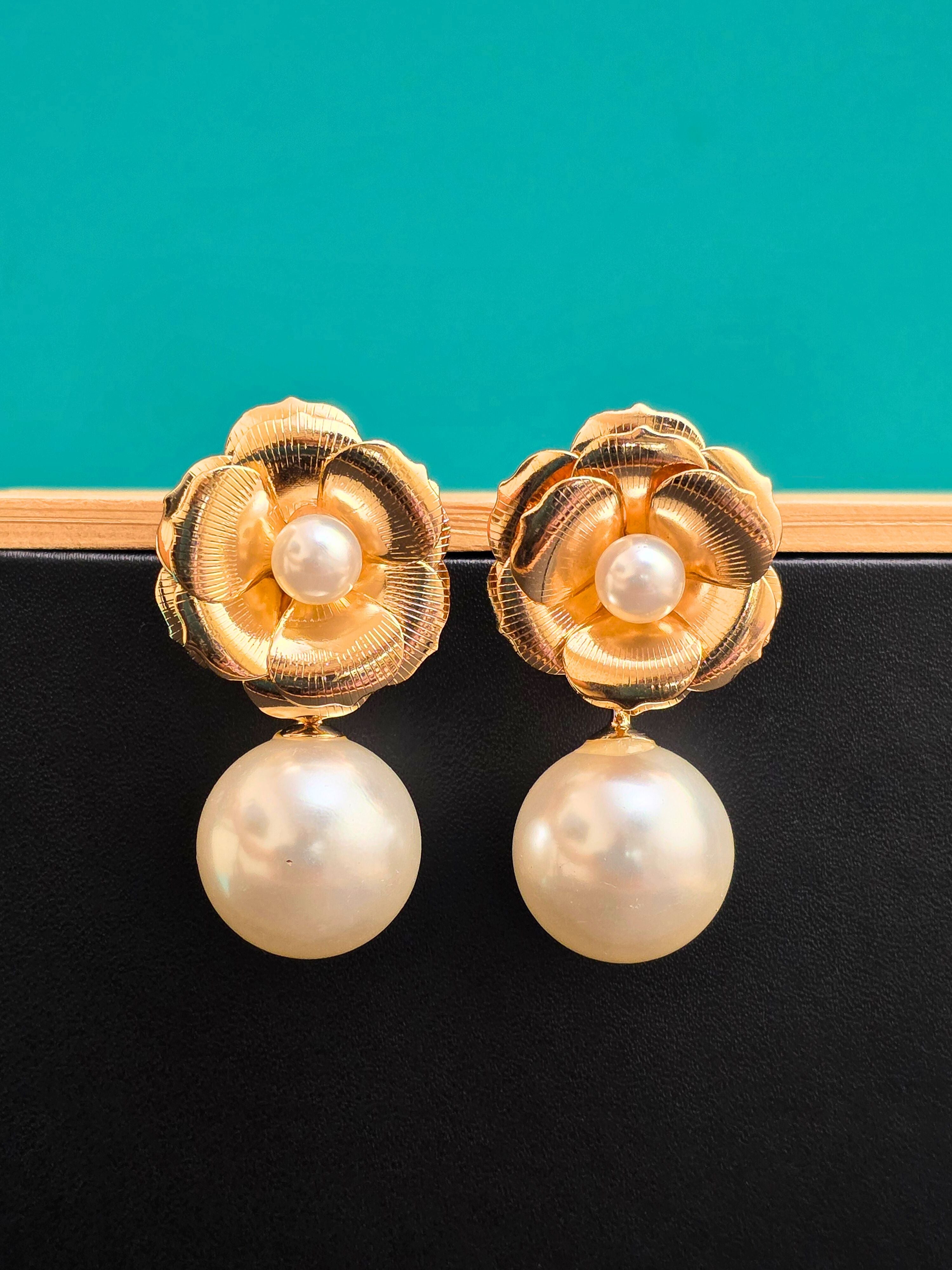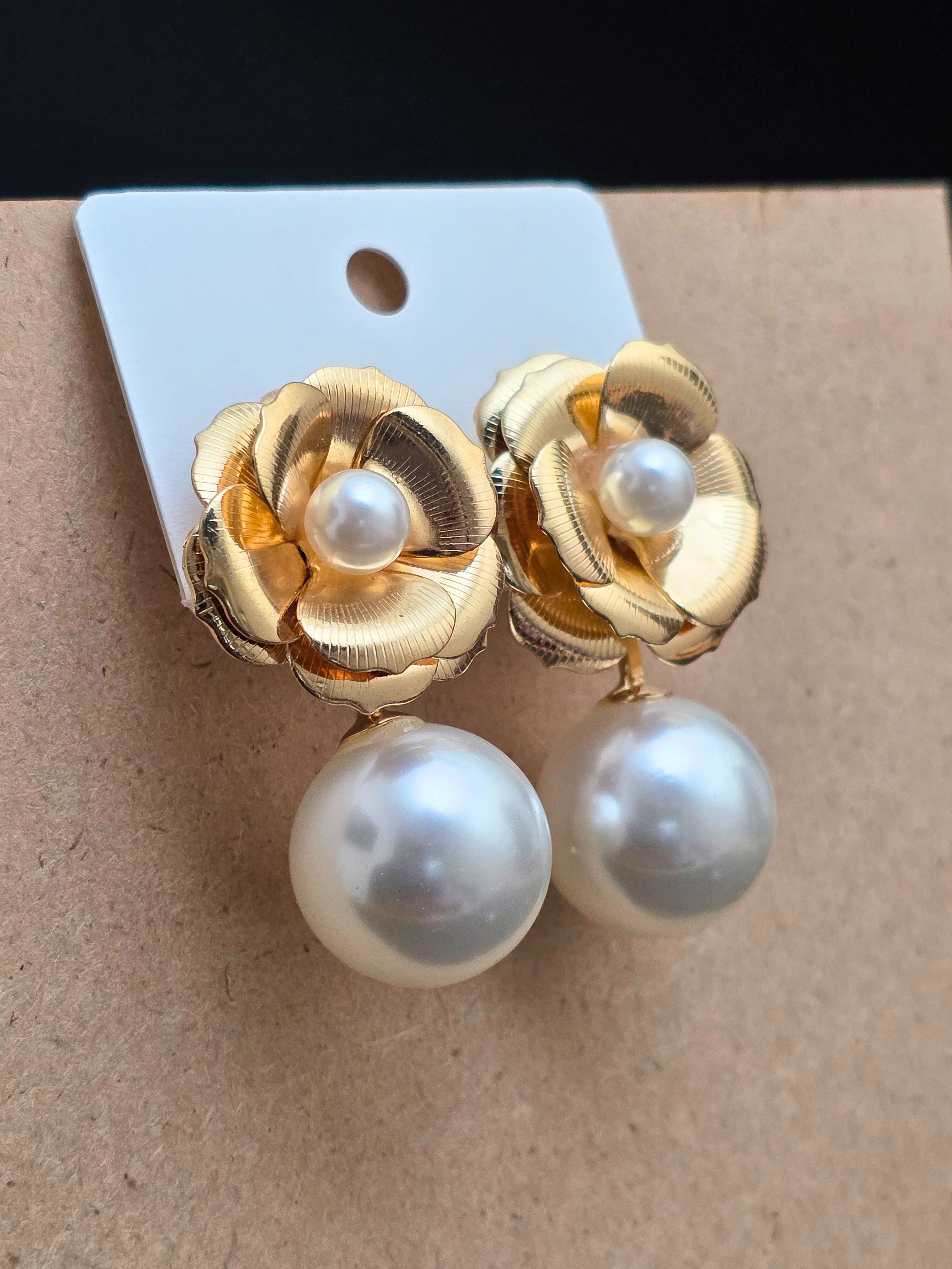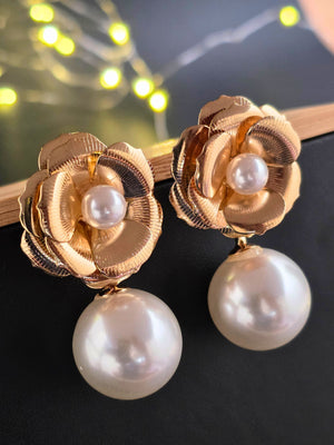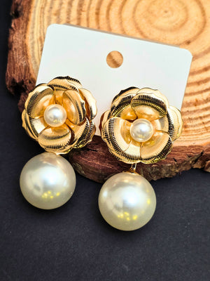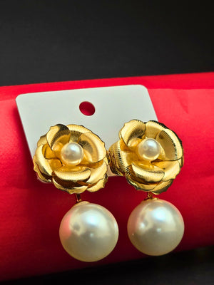 Rose Flower Pearl Studded Earrings with Pearl Hangings