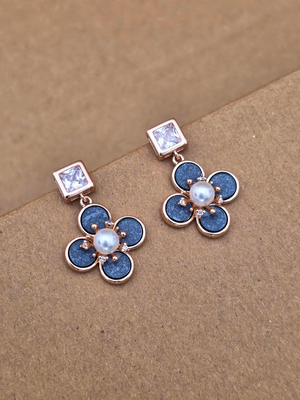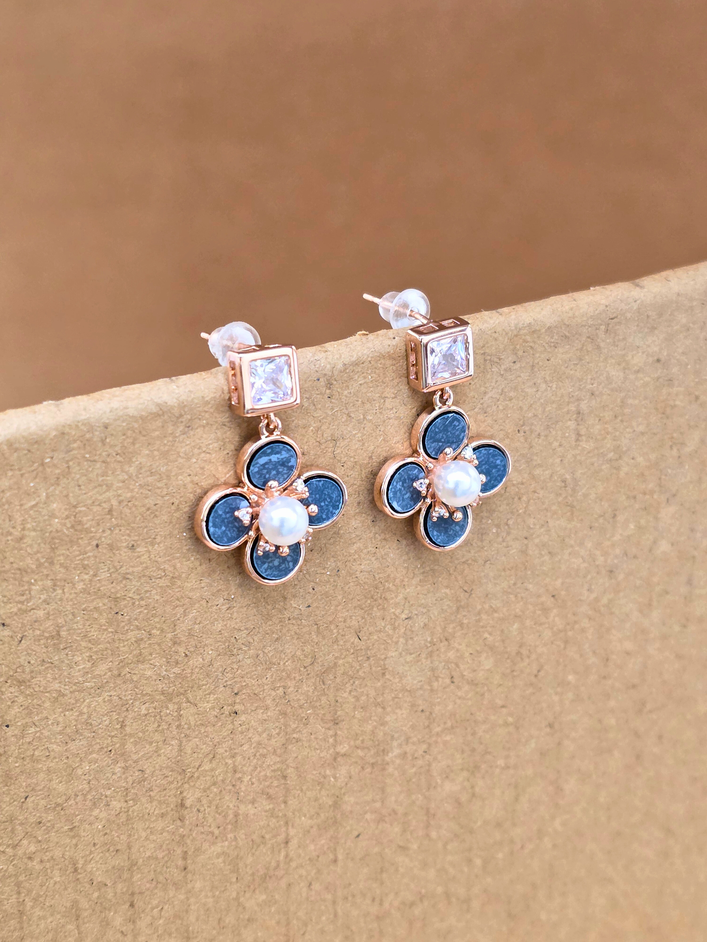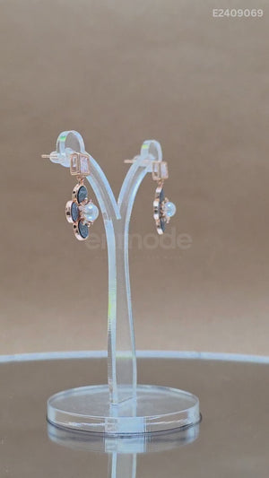 Rose Gold Flower Drop Earrings with Black Accents and Cubic Zirconia Stud