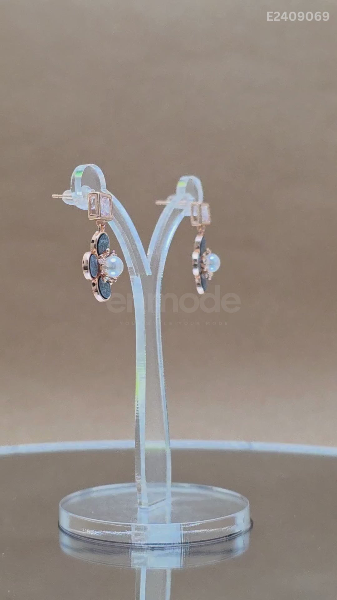 These elegant drop earrings feature a chic floral design in rose gold with rich black accents, creating a stunning contrast. The earrings are adorned with a sparkling cubic zirconia stud at the top, adding a touch of glamour. The delicate flower shape is perfect for both formal and casual occasions, offering a sophisticated yet playful vibe. Lightweight and comfortable, these earrings are a must-have accessory for any jewelry collection, blending modern design with timeless charm. Perfect for adding a touch of elegance to your everyday look or complementing your evening wear.