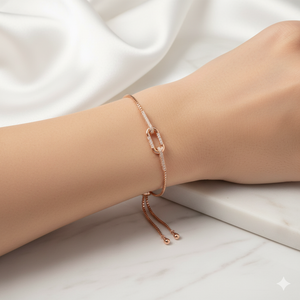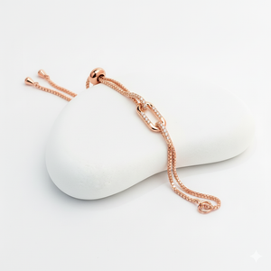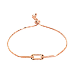 This chic and sophisticated bracelet features a sleek, rose gold-plated chain with a central pave-encrusted link design, adding a touch of sparkle and elegance. The adjustable pull-chain closure ensures a customizable fit, making it perfect for any wrist size. With its minimalist and refined aesthetic, this bracelet is ideal for both casual and formal wear, adding a modern touch to any outfit.
