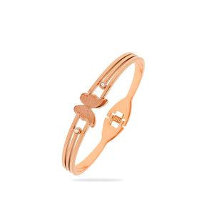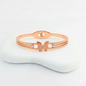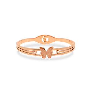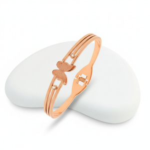 This stunning bracelet showcases a delicate butterfly charm at the center, accompanied by sparkling crystal accents on either side. The bracelet features a rose gold-plated finish that enhances its elegance and modern appeal. With its triple-band design and lightweight feel, this bracelet is perfect for daily wear or special occasions. The secure snap-lock closure ensures a comfortable fit and ease of use.