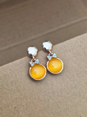 These elegant dangle earrings feature a captivating round Orange cat’s eye stone, set in a rose gold-plated frame. A delicate crystal accent adorns the top of the design, adding a touch of sparkle to the overall sophisticated look. The earrings are perfect for both casual and special occasions, offering a pop of color and style to any ensemble. The secure push-back closure ensures a comfortable fit, making these earrings a chic addition to your jewelry collection.