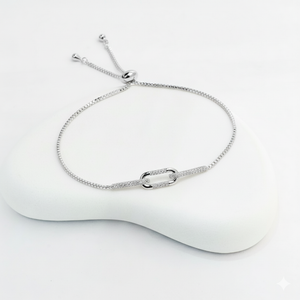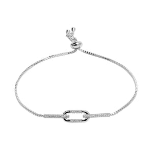 This chic and sophisticated bracelet features a sleek, silver-plated chain with a central pave-encrusted link design, adding a touch of sparkle and elegance. The adjustable pull-chain closure ensures a customizable fit, making it perfect for any wrist size. With its minimalist and refined aesthetic, this bracelet is ideal for both casual and formal wear, adding a modern touch to any outfit.