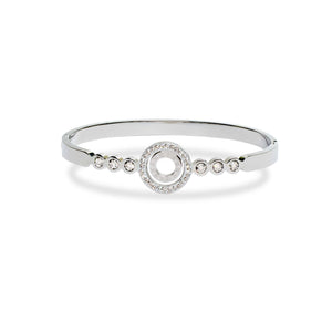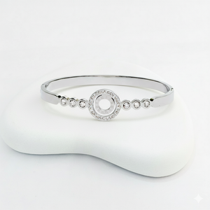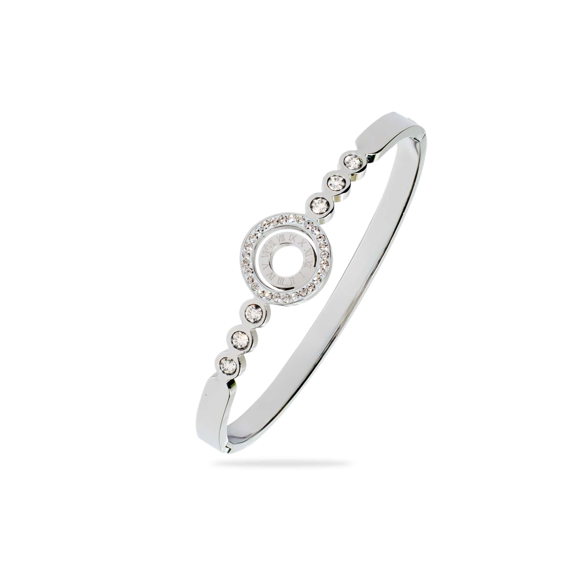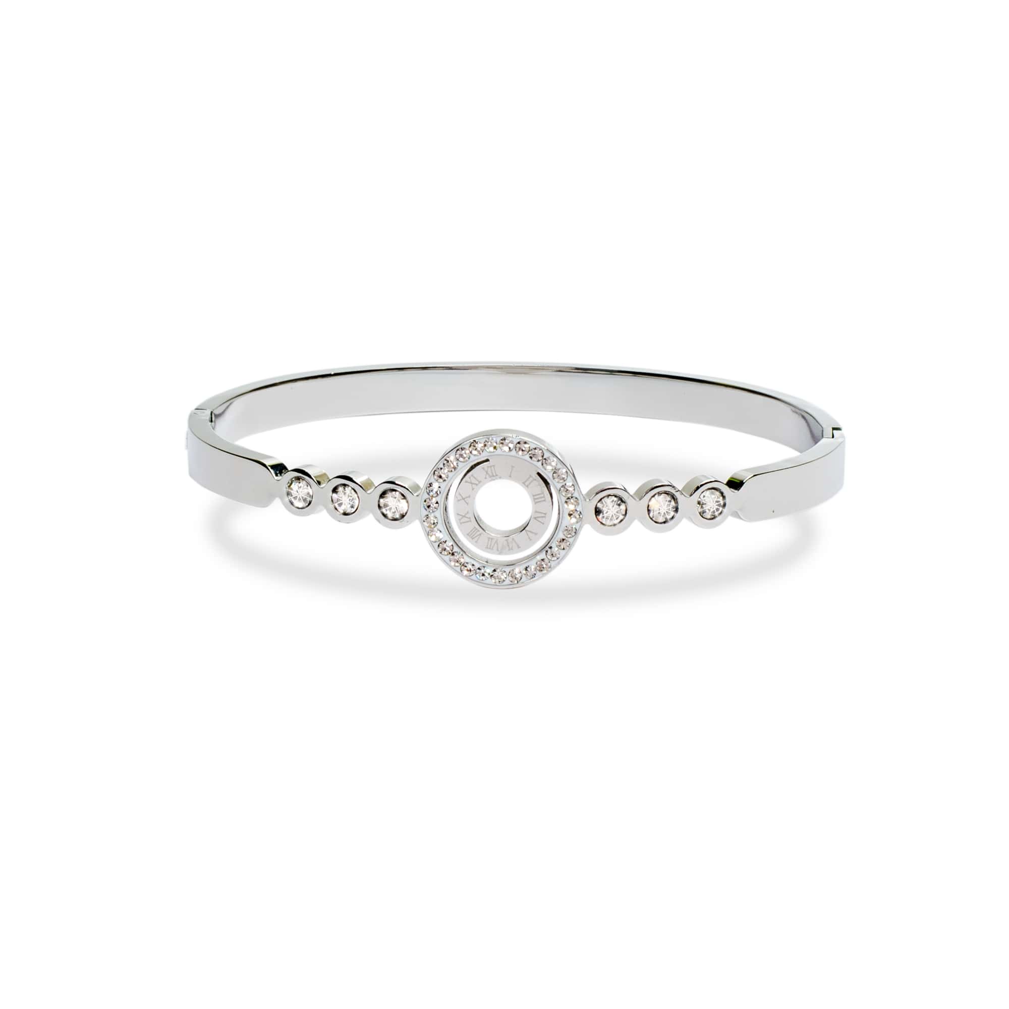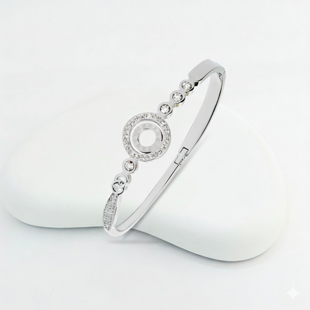 This elegant silver-plated bracelet features a modern design with a central round dial motif surrounded by sparkling cubic zirconia stones. Its minimalist yet sophisticated look makes it perfect for both casual and formal occasions. The bracelet is designed with a unique Roman numeral detailing at the center, adding a timeless charm. Its slim structure and refined finish make it a stunning piece for layering or wearing alone.