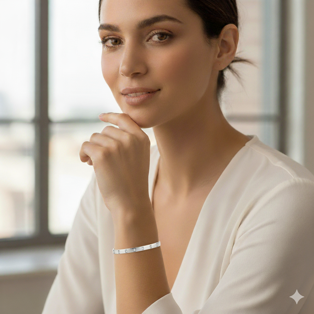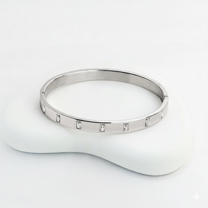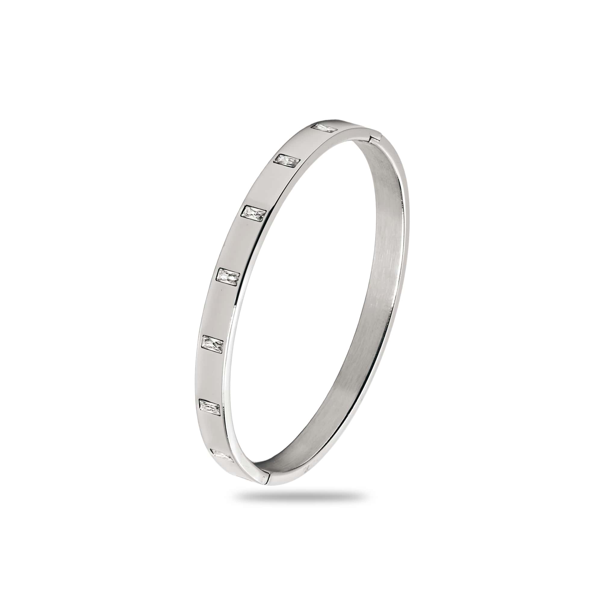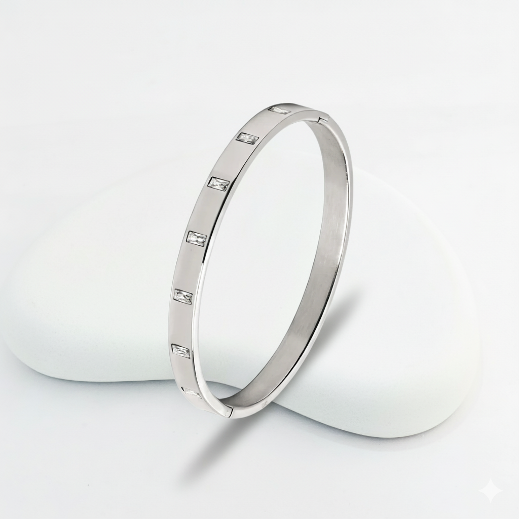 This modern and sophisticated silver-toned bangle bracelet is designed for those who appreciate sleek elegance. Adorned with rectangular baguette-cut cubic zirconia stones evenly spaced around the band, this bracelet offers a polished look. The seamless design and clasp closure add to its minimalistic charm, making it perfect for both formal occasions and casual wear. Its smooth finish and high-quality craftsmanship ensure it will be a staple accessory in your collection.