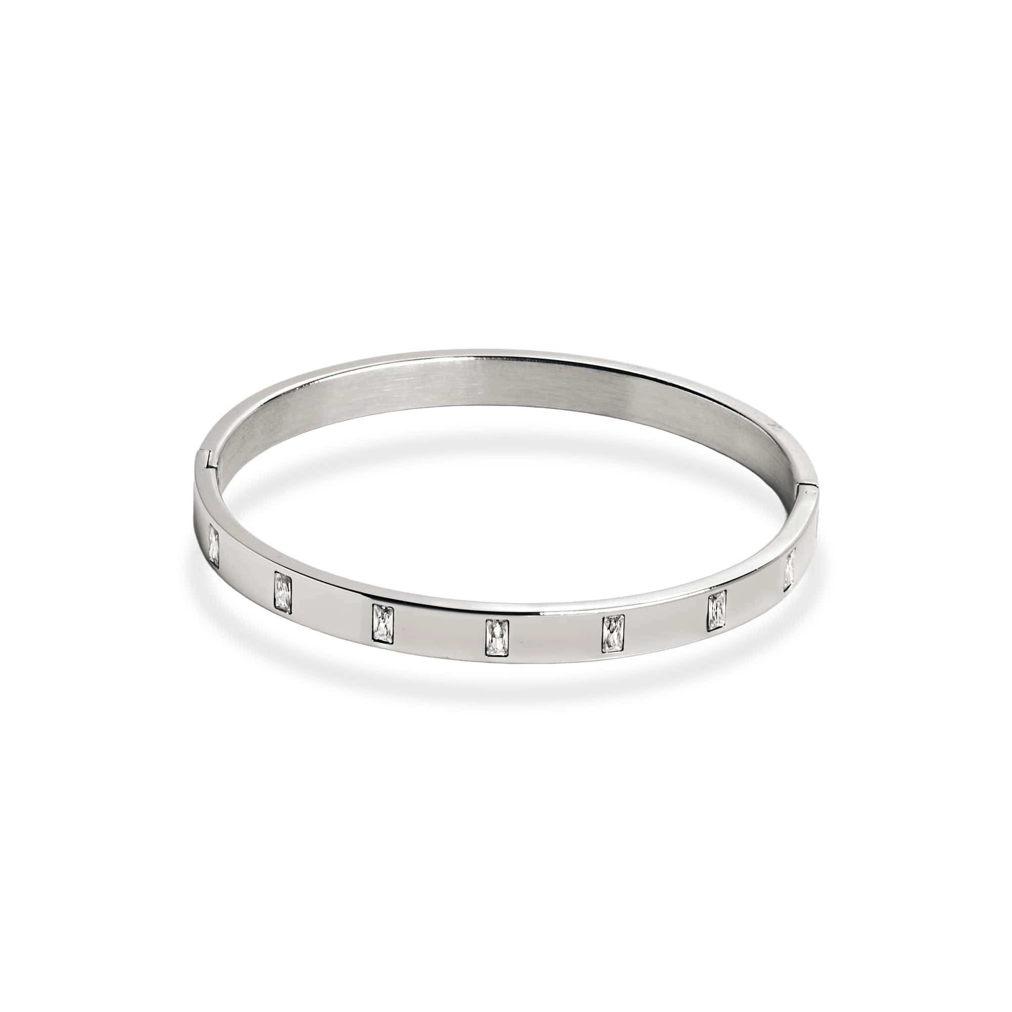 Sleek Silver-Toned Bangle Bracelet with Baguette Cubic Zirconia Inlay